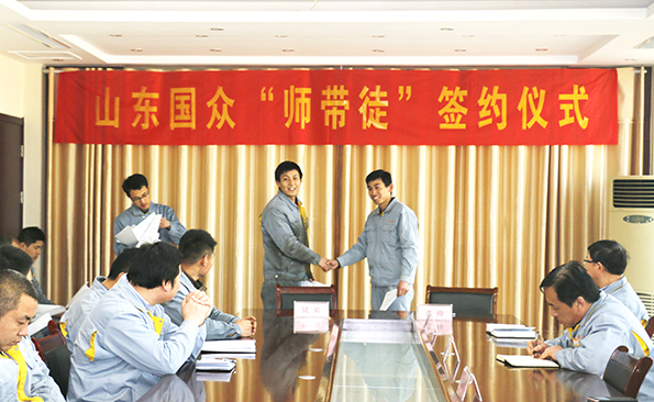 2017年3月14日,山東國眾機械科技有限公司隆重舉行“師帶徒”簽約儀式,公司總經(jīng)理謝文成、常務(wù)副總經(jīng)理劉文吉、崔新平等公司領(lǐng)導(dǎo)、公司各分部經(jīng)理及部分師傅與徒弟代表參加了儀式活動,劉文吉主持儀式。